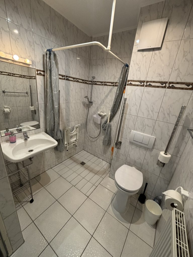 - 🚾 Erhöhtes WC mit Haltegriffen, Waschbecken rollstuhlgerecht unterfahrbar