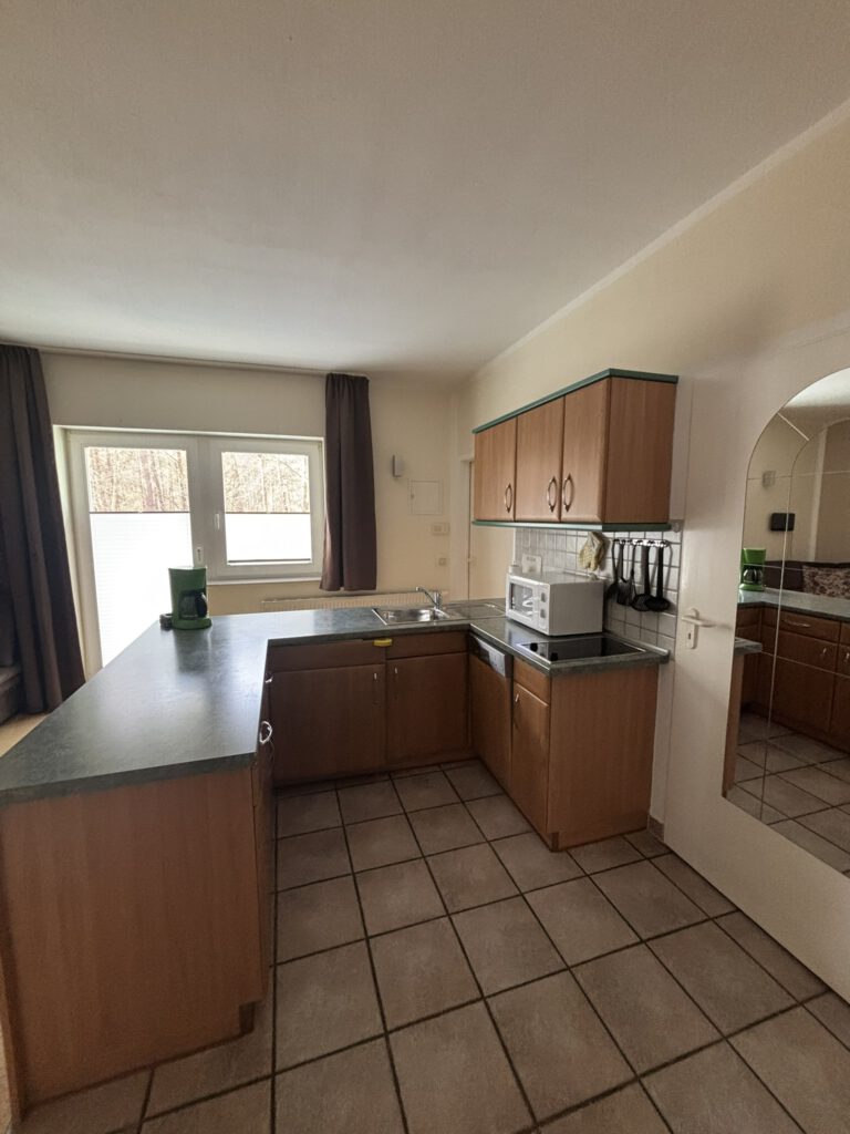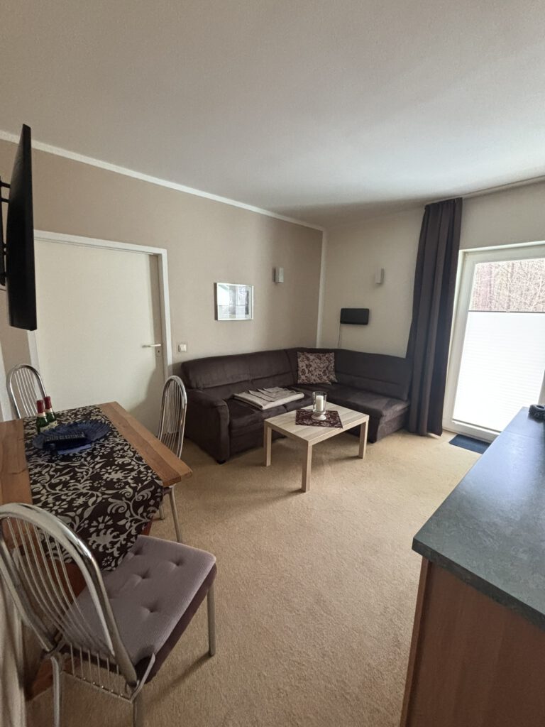 Die Wohnung 6 im Obergeschoss bietet 50 m² mit 3 Zimmern und einem Balkon zum Wald. Eine Ferienwohnung zum Wohlfühlen, modern ausgestattet und praktisch geschnitten.