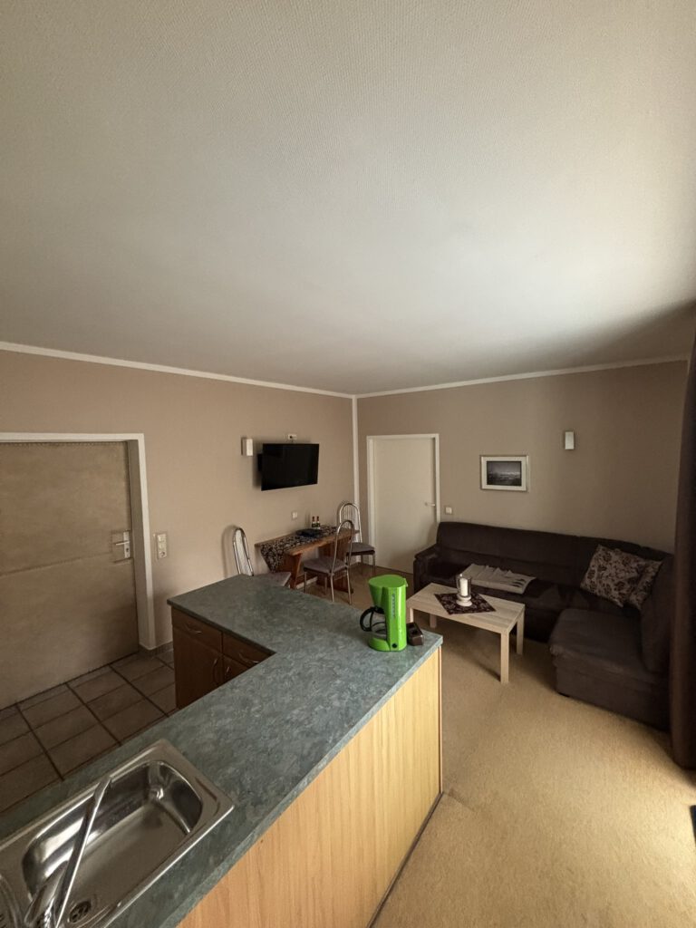 - 🍳 Küchenzeile mit 2 Herdplatten, Kühlschrank, Mikrowelle, Wasserkocher, Kaffeemaschine, Toaster, Töpfen, Geschirr & Spülmaschine